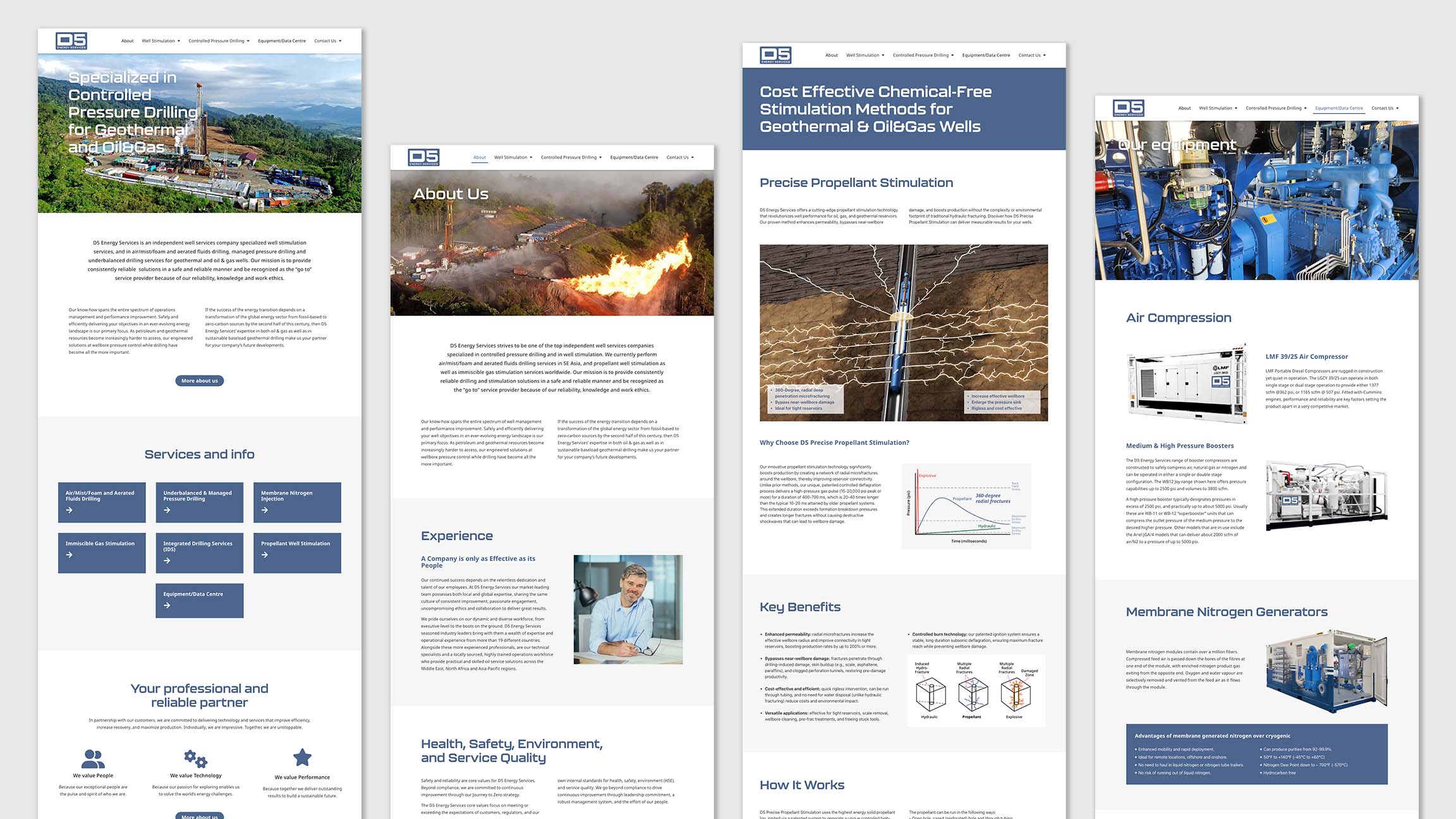 From this foundation, the brand was consistently applied across the website UI. The website supports D5’s positioning as a specialist in well stimulation, managed pressure drilling and geothermal services, while presenting complex information in a clear and structured way. In addition, a series of brochures and technical spec sheets were designed to communicate detailed content in an accessible and well organised format, tailored to different audiences and use cases.